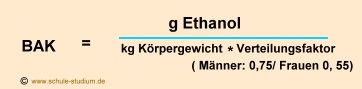 In 100 ml sind folglich enthalten: 100 ml Bier entsprechen 4 ml Ethanol 100 ml Apfelwein entsprechen 7 ml Ethanol 100 ml Wein entsprechen 10 ml Ethanol 100 ml Sekt entsprechen12 ml Ethanol. 100 ml Korn 32 ml Ethanol. 100 ml Cognac 40 ml Ethanol. Trinkt also jemand 4 Bierkrüge. So sind dies 2 l, also 2000 ml. 2000 ml entsprechen 80 ml Ethanol. Um ml in g umzurechnen müssen wir die Dichte von Ethanol zur Hilfe nehmen: Dichte Ethanol = 0,789 g/ml. Die Blutalkoholkonzentration in pro/Mille berechnet man mit Hilfe folgender Formel: ![]() 4 getrunkene Bierkrüge (2l Bier) entsprechen also - für eine Frau mit 50 kg eine Blutalkoholkonzentration von 2, 296 - für eine Frau mit 55 kg Körpergewicht eine Blutalkoholkonzentration von 2, 09 - für eine Frau mit 60 kg Körpergewicht eine Blutalkoholkonzentration von 1, 91 - für eine Frau mit 65 kg Körpergewicht eine Blutalkoholkonzentration von 1, 77 - für eine Frau mit 70 kg Körpergewicht eine Blutalkoholkonzentration von 1, 64 - für einen Mann mit 60 kg Körpergewicht eine Blutalkoholkonzentration von 1, 40 - für einen Mann mit 65 kg Körpergewicht eine Blutalkoholkonzentration von 1, 29 - für einen Mann mit 70 kg Körpergewicht eine Blutalkoholkonzentration von 1, 20 - für einen Mann mit 75 kg Körpergewicht eine Blutalkoholkonzentration von 1, 12 - für einen Mann mit 80 kg Körpergewicht eine Blutalkoholkonzentration von 1, 052 - für einen Mann mit 85 kg Körpergewicht eine Blutalkoholkonzentration von 0, 99 - für einen Mann mit 90 kg Körpergewicht eine Blutalkoholkonzentration von 0, 93 - für einen Mann mit 95 kg Körpergewicht eine Blutalkoholkonzentration von 0, 89 - für einen Mann mit 100 kg Körpergewicht eine Blutalkoholkonzentration von 0, 84 Wichtiger Hinweis: Trotz sorgfältiger Berechnung dieser BAK-Werte kann keine Gewähr für die Richtigkeit dieser Berechnungen übernommen werden. Irrtümer sind nicht ausgeschlossen!! Alle Angabe ohne Gewähr !!! Stadien der Alkoholwirkung: